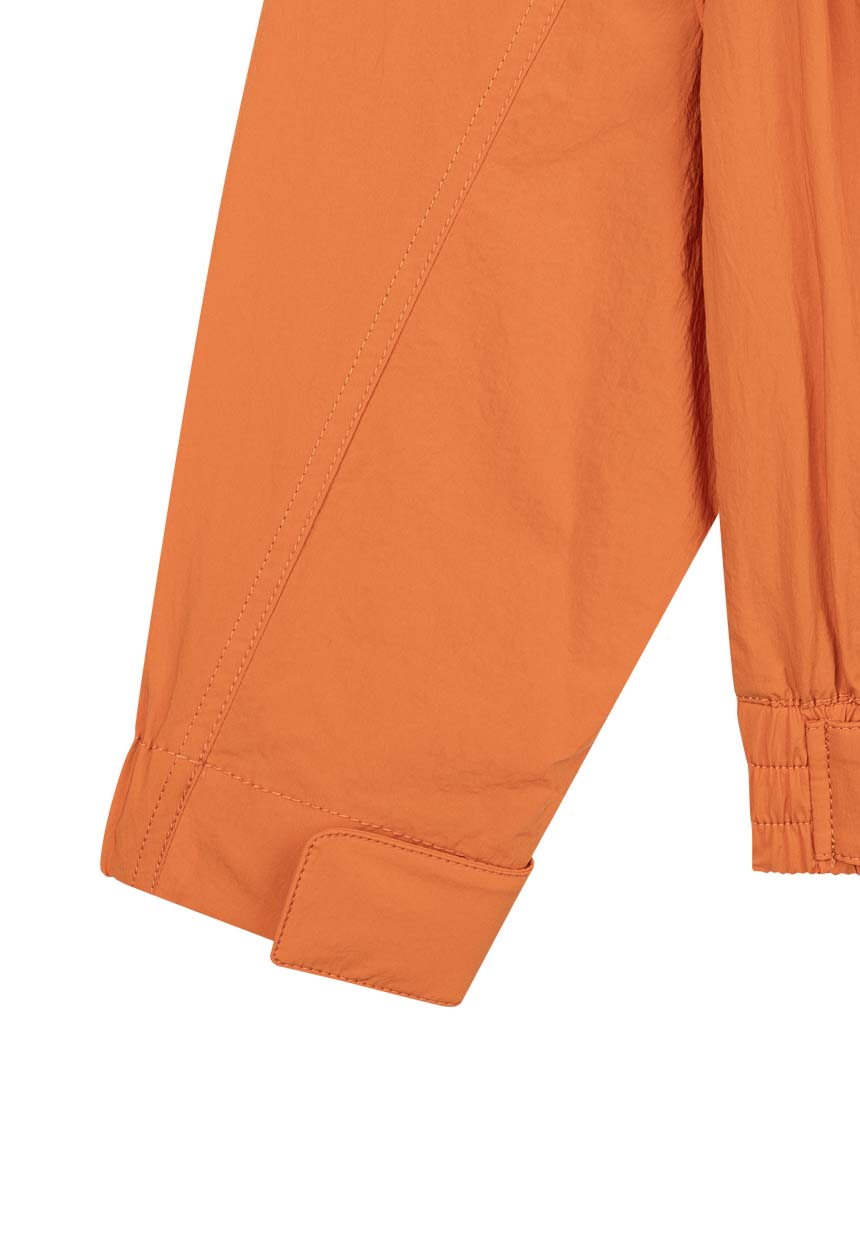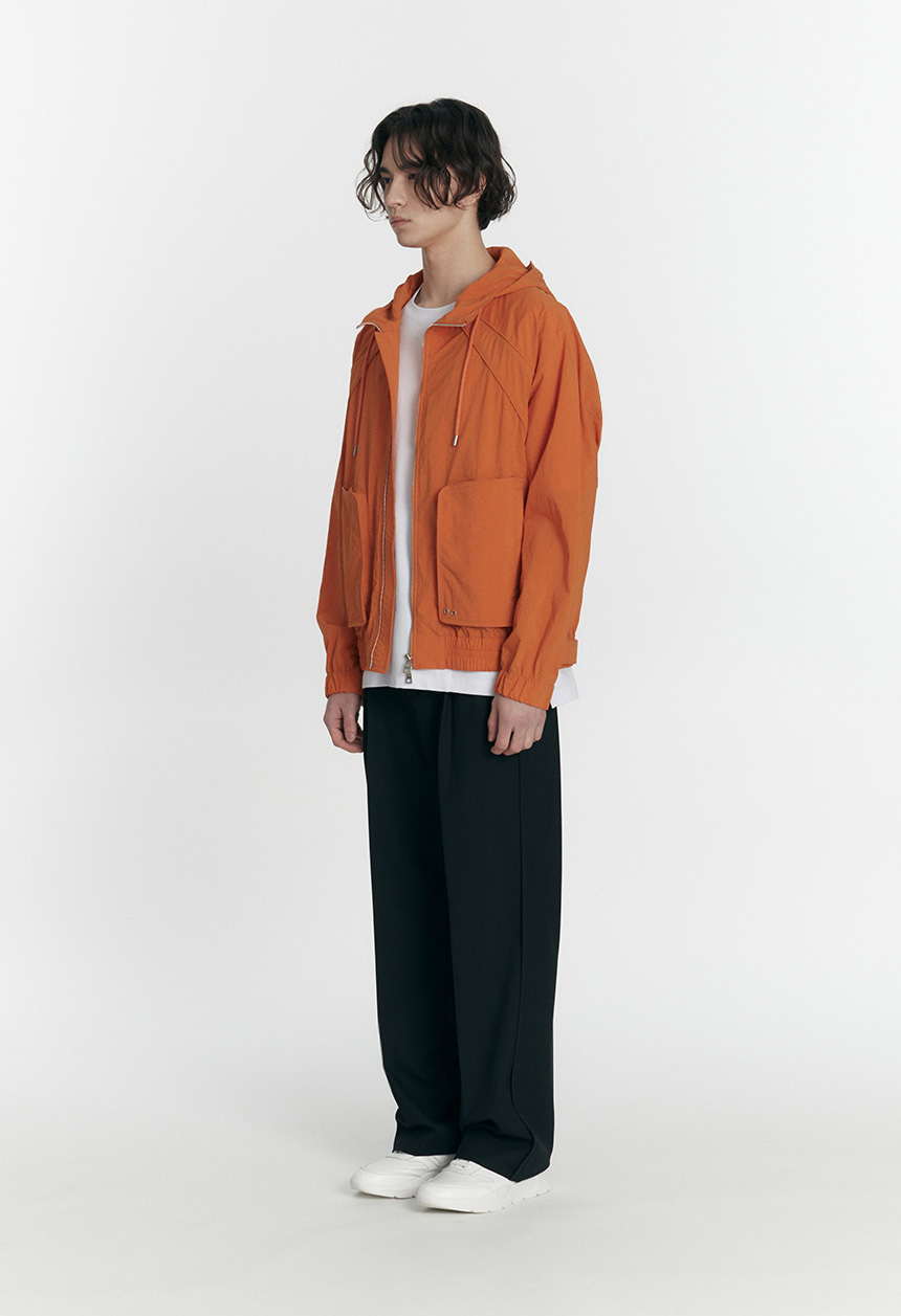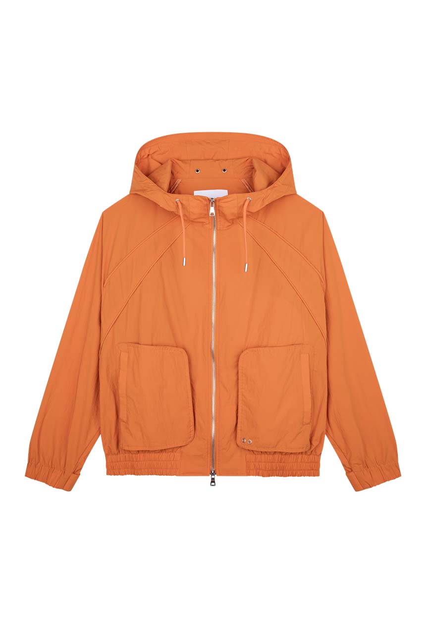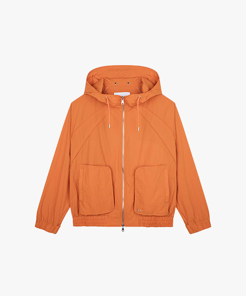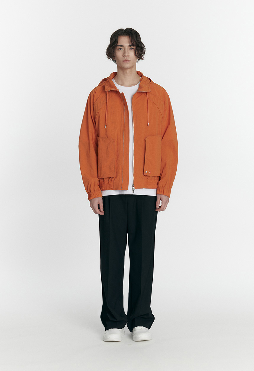 アウトポケットのディテールでデザインポイントを加え、2WAYジッパーと袖口、裾のリブディテールで実用性を高めたオレンジカラーのユニークな間季用ジャケットです。